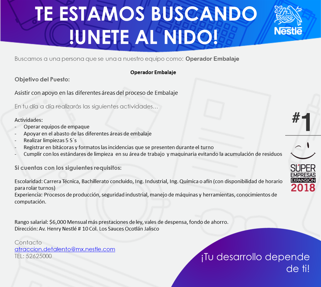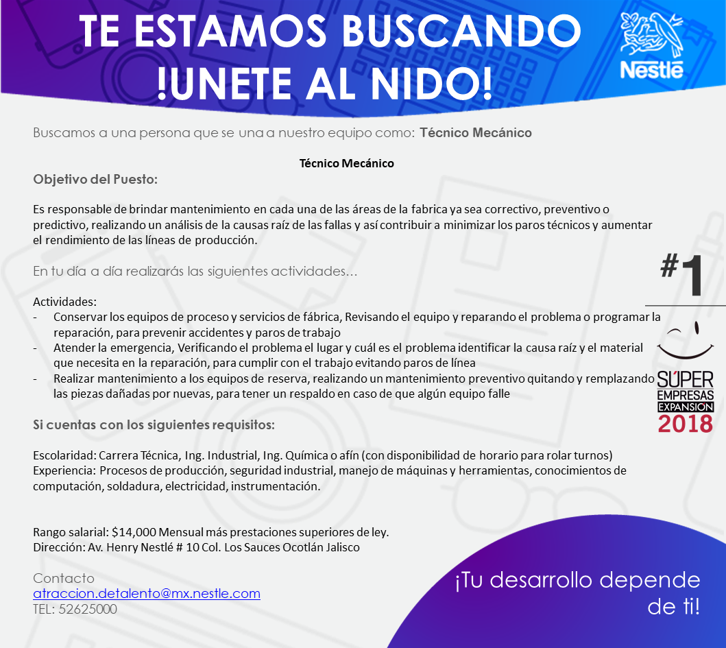 Formación:Carrera Técnica, Bachillerato concluido, Ing. Industrial (con disponibilidad de horario para rolar turnos)