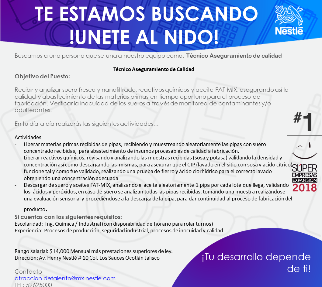 Formación:Carrera Técnica, Bachillerato concluido, Ing. Industrial, Ing. Química o afín (con disponibilidad de horario para rolar turnos)